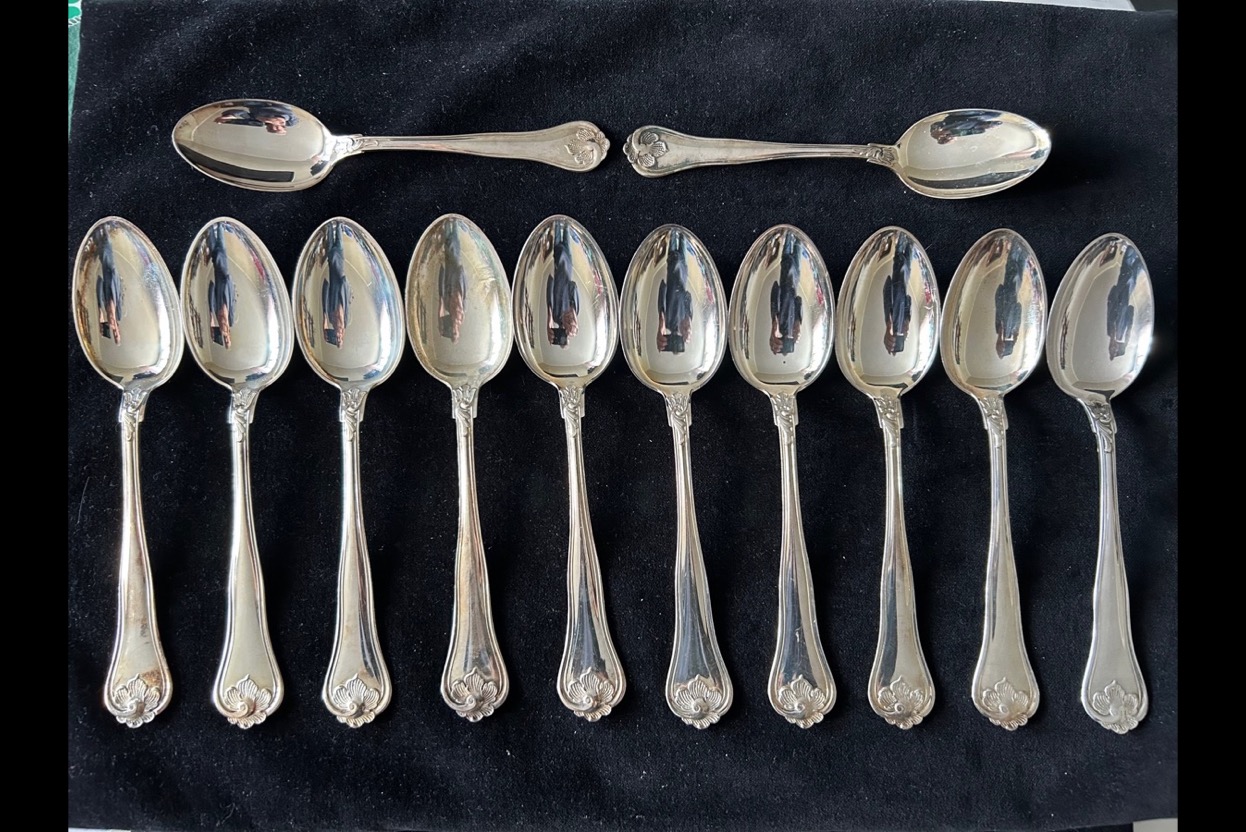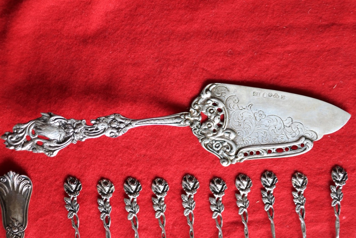 Kontrollerat silver: 10+10 kaffe/teskedar -tårtspade av Sigurd Carlsson Stockholm 1949 - samt matske...
