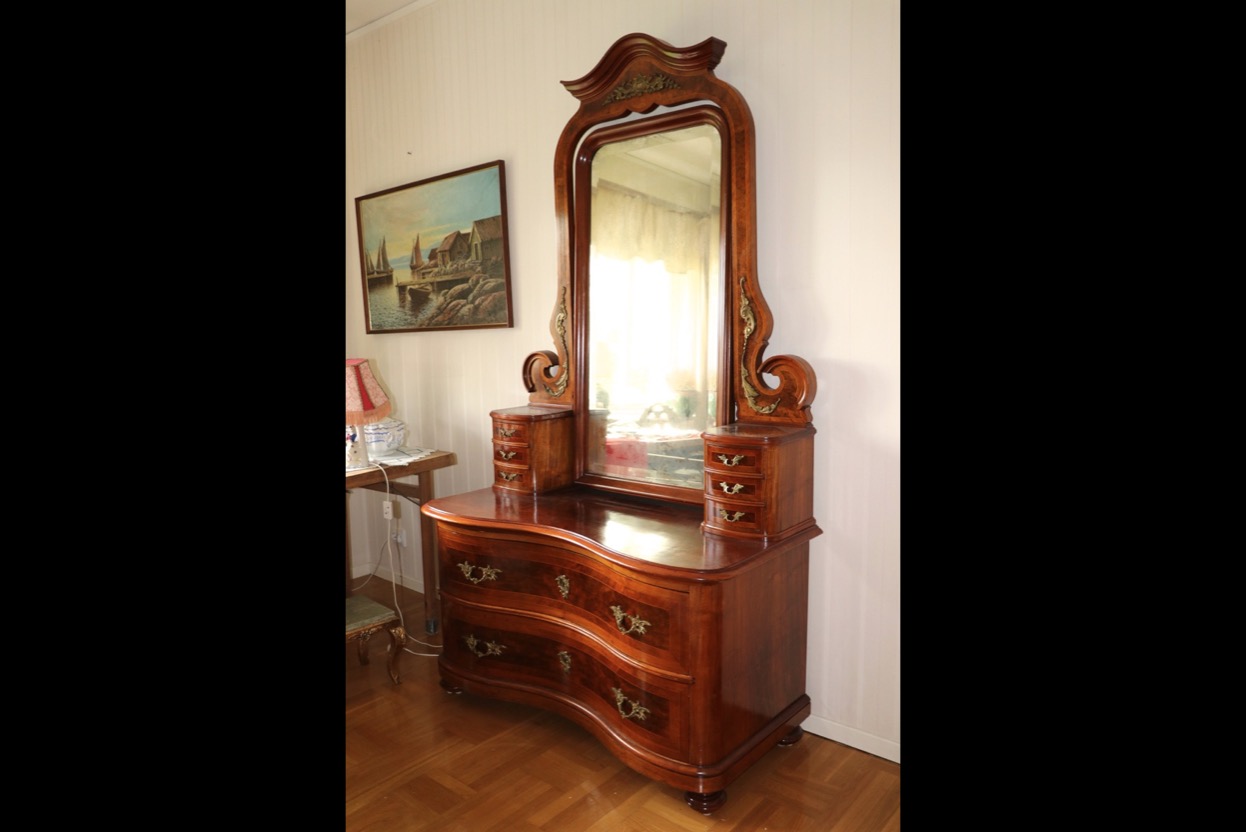 Spegelbyrå ca 1890 i valnöt/valnötsrot -svängd lådfront -gjutna beslag i mässing -höjd 207 bredd 118...