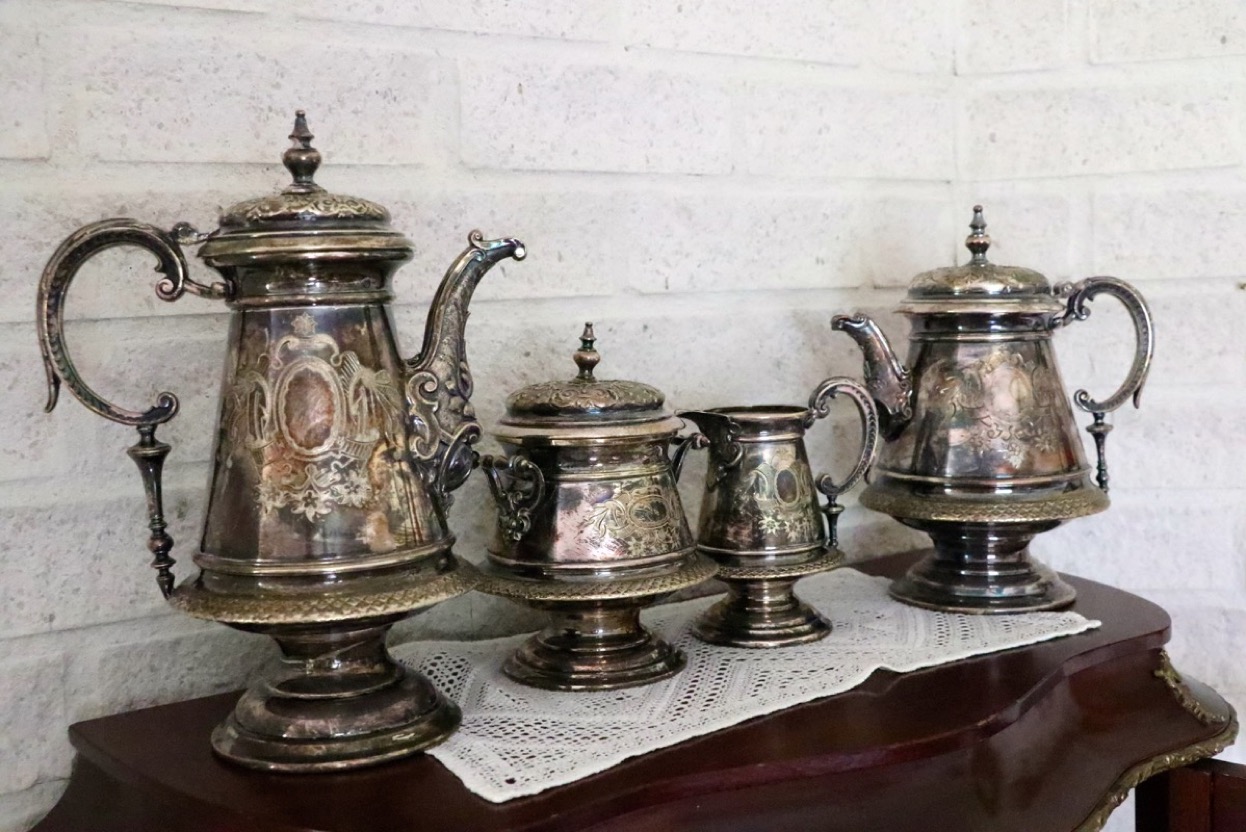 Antik servis i nysilver 4 delar -högsta 29 cm. Säljes från välvårdat hem i Örebro utlämning Sönd...