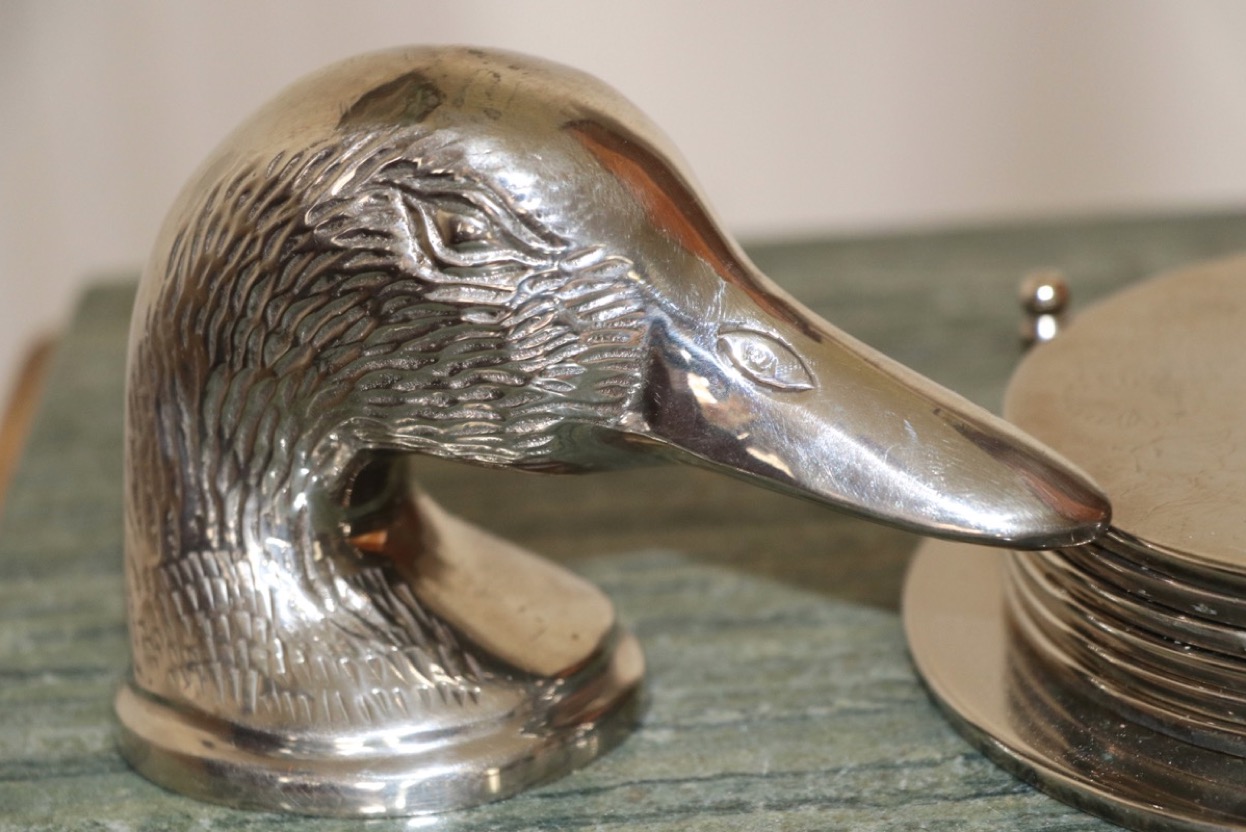 Flasköppnare "Ducky" 1950 -60 tal samt ställ med coasters i nysilver. Säljes från välvårdat hem ...