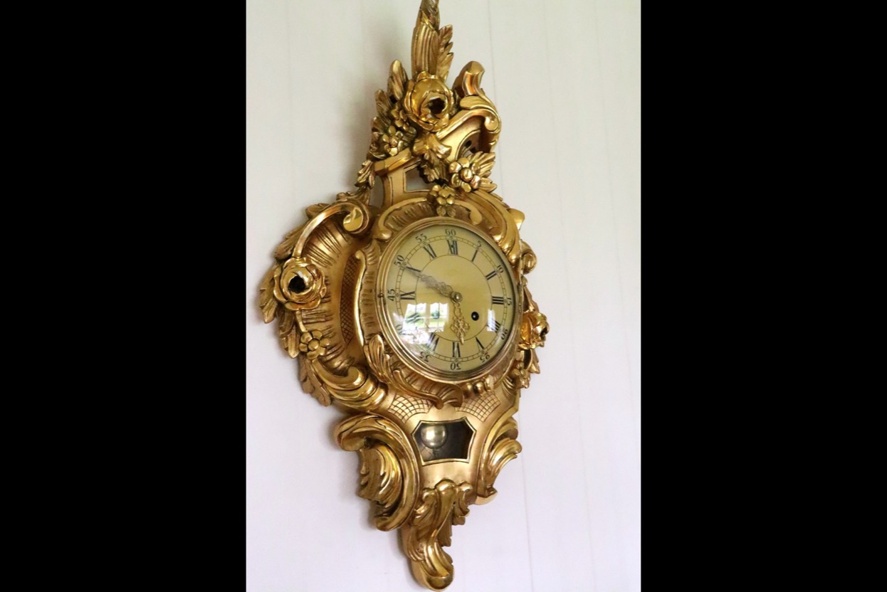 Större Väggur i förgyllt trä -höjd 74 x 40 cm. Säljes från välvårdat hem i Örebro utlämning Sön...