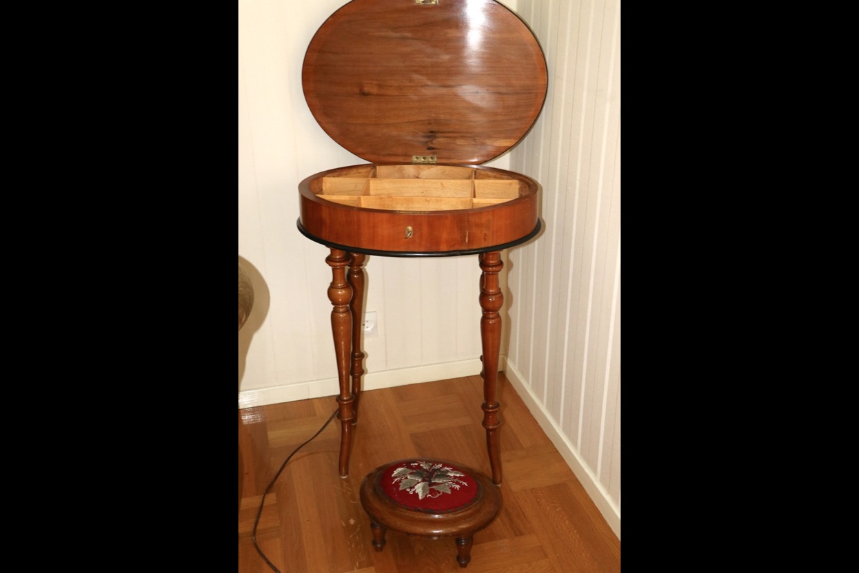 1800 tal -sybord i valnöt med pärl broderad fotpall - höjd bord 75 cm skiva 48x58 cm -åldersslitage....