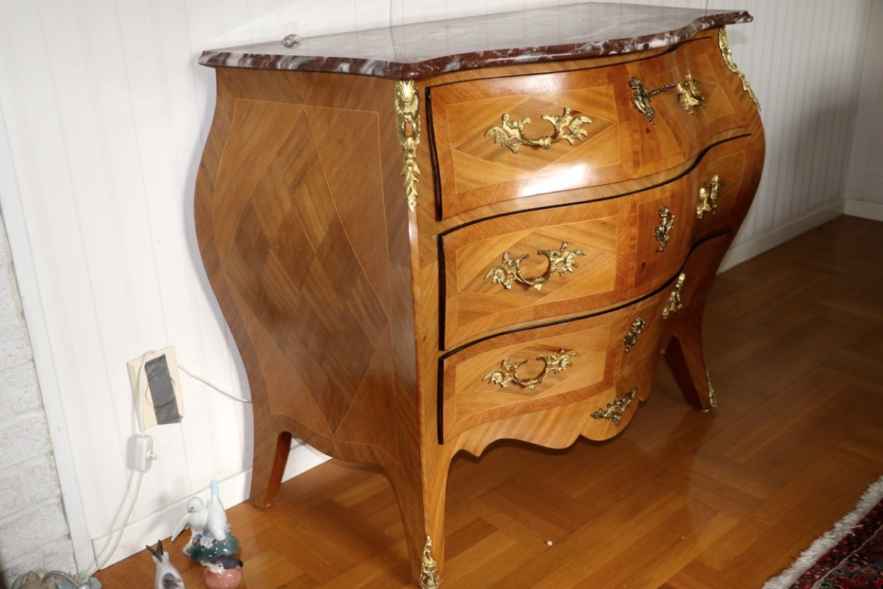 3 lådig stilbyrå med flerfaner -skiva i marmor -gjutna beslag i mässing -höjd 80 bredd 100 -52 cm. ...