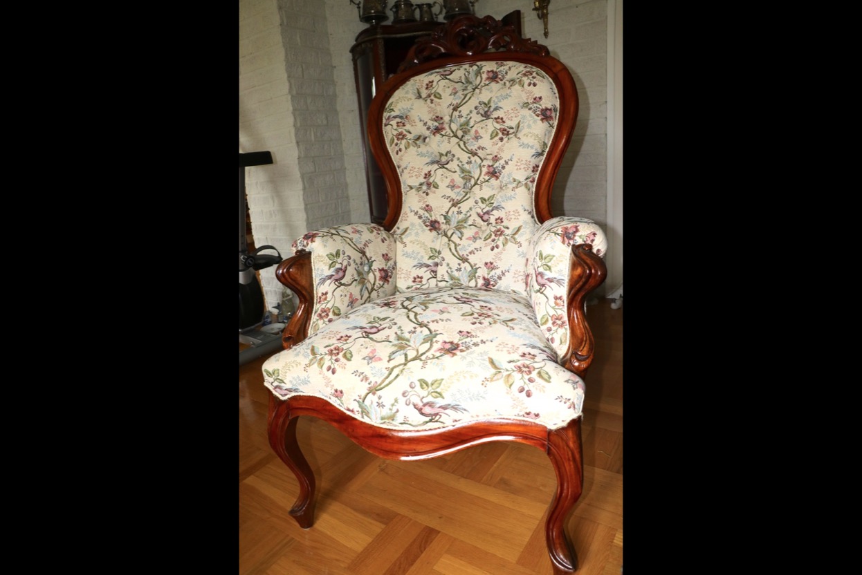 Läsfåtölj- bra tyg med fågelmotiv mitten 1900 -även klädd i rygg - höjd 122 bredd 72 cm. Säljes f...
