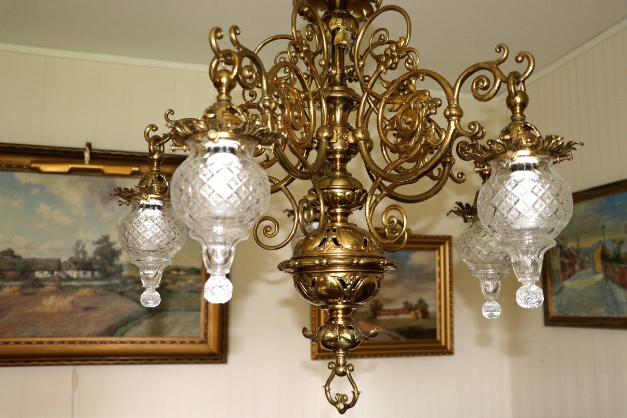 Ljuskrona i massiv mässing -lampkupor i slipad kristall - höjd 120 cm -diam 70 cm. Säljes från v...