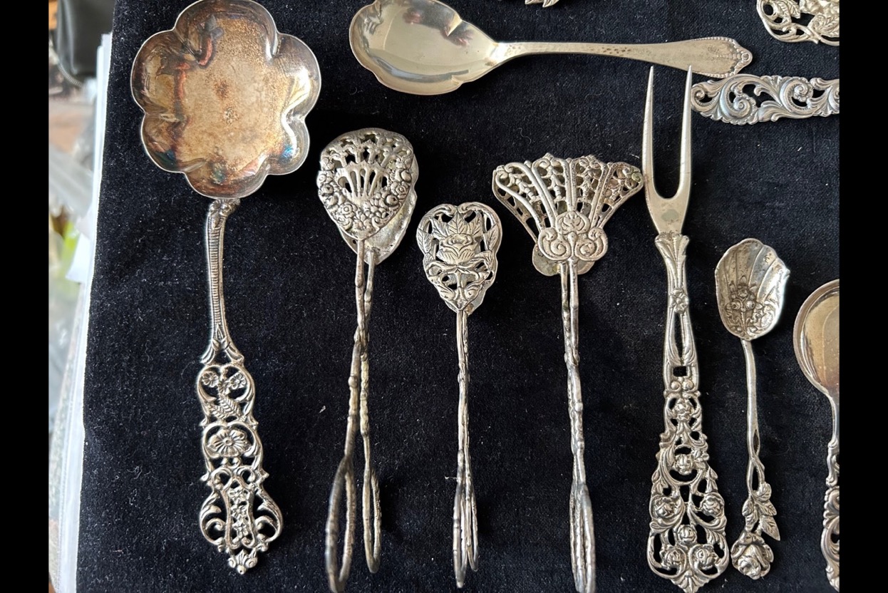 Kontrollerat silver: bla kaktänger -tårtspade -skedar - total vikt 530 gram. Säljes från välvårdat...