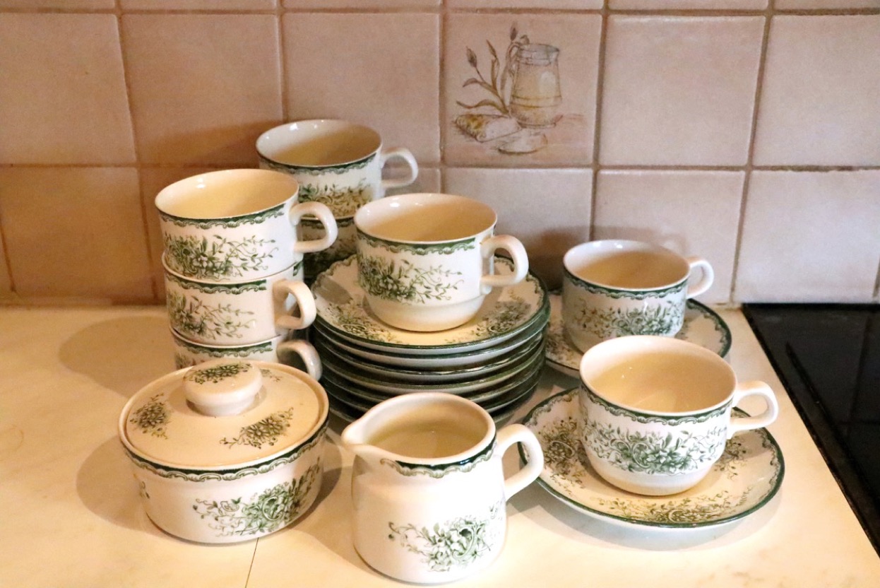 36261Kaffeservis Gröna Anna Rörstrand -9 st koppar med fat -gräddkanna o sockerskål Säljes från välvårdat...