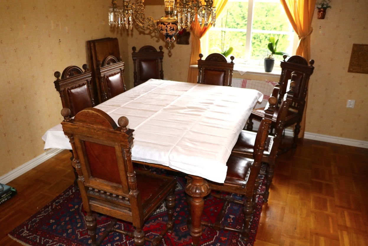 36268Matsalsbord ca 1900 i ek -8 stolar ny omklädda med skinn -bord med hjulförsedda ben -mått på bild s...