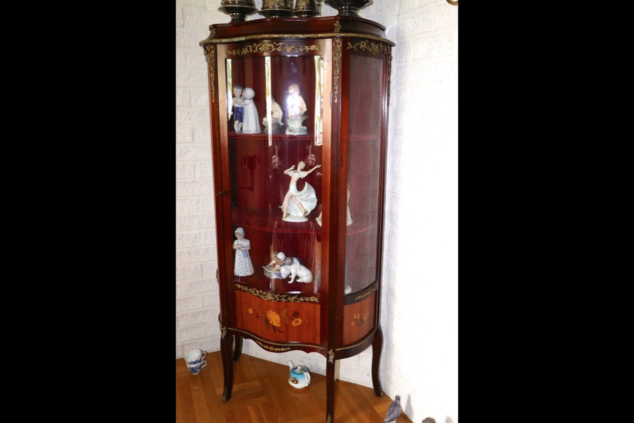 36249Vitrinskåp med intarsia -svängd front -beslag i gjuten mässing -häjd 142 cm bredd 70 x 33 cm -sälje...