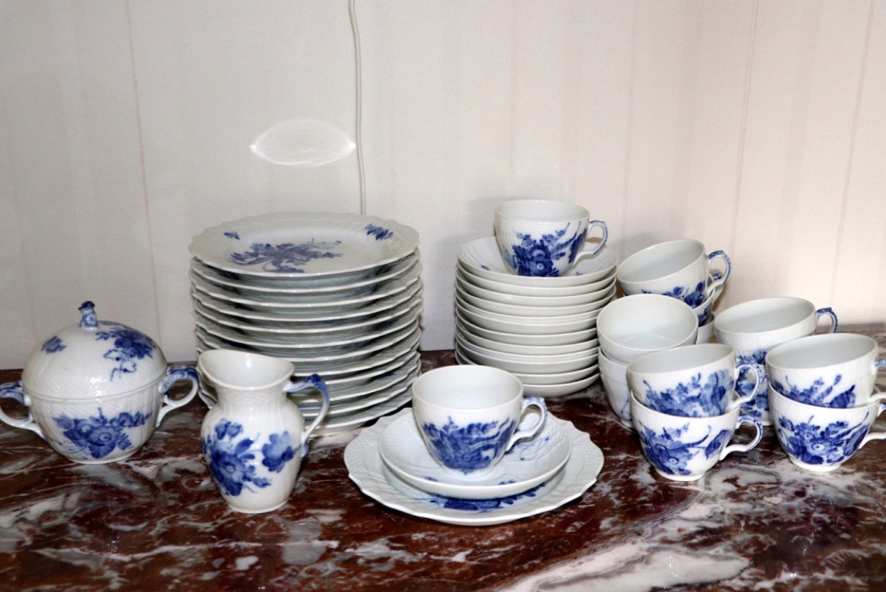 36251Royal Copenhagen Kunglig Dansk Blå blomster 13 koppar med fat -13 assietter - gräddkanna och sockers...