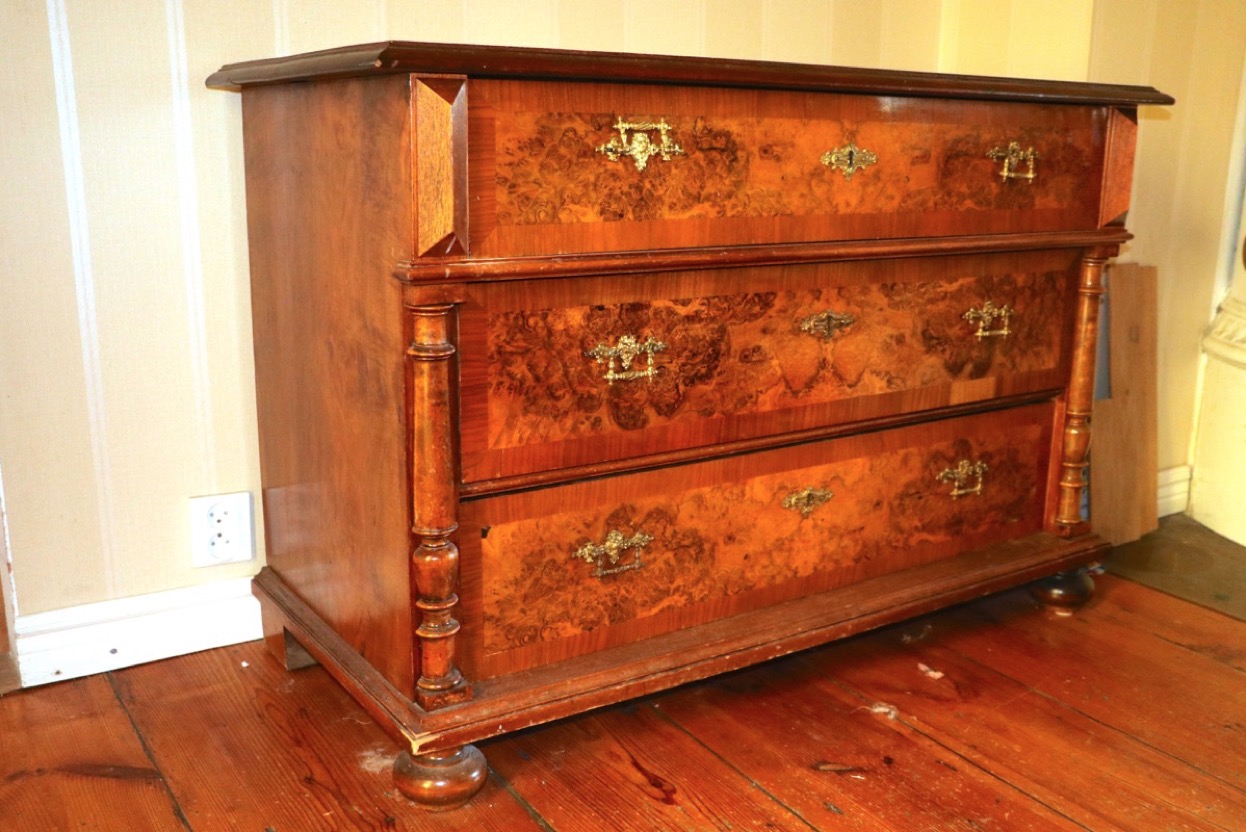 362573 lådig byrå 1800 tal i valnöt/valnötsrot -gjutna beslag i mässing -bredd 119 x 54 cm höjd 77 cm. ...