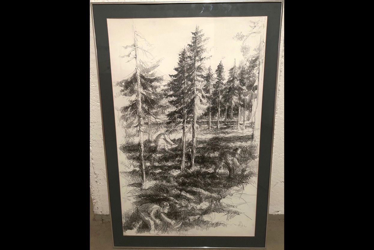 36347Tavla Stig Olson "lingon plockning" blyerts alt krita -mått med ram 67x100 cm. Säljes från välvård...