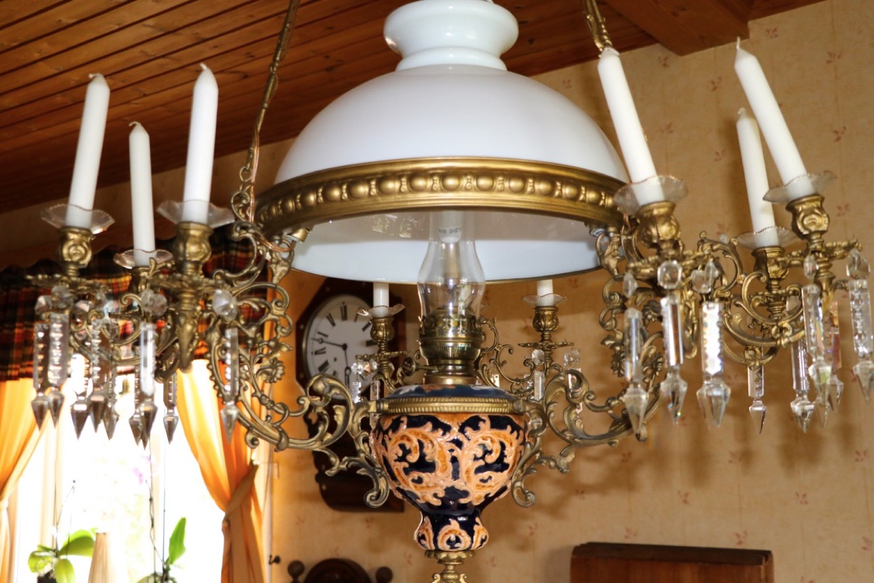 36277Större hängfotogen lampa salsmodell 18.00 tal- oljehus i majolika - ljushållare -eldragen -reglerbar...