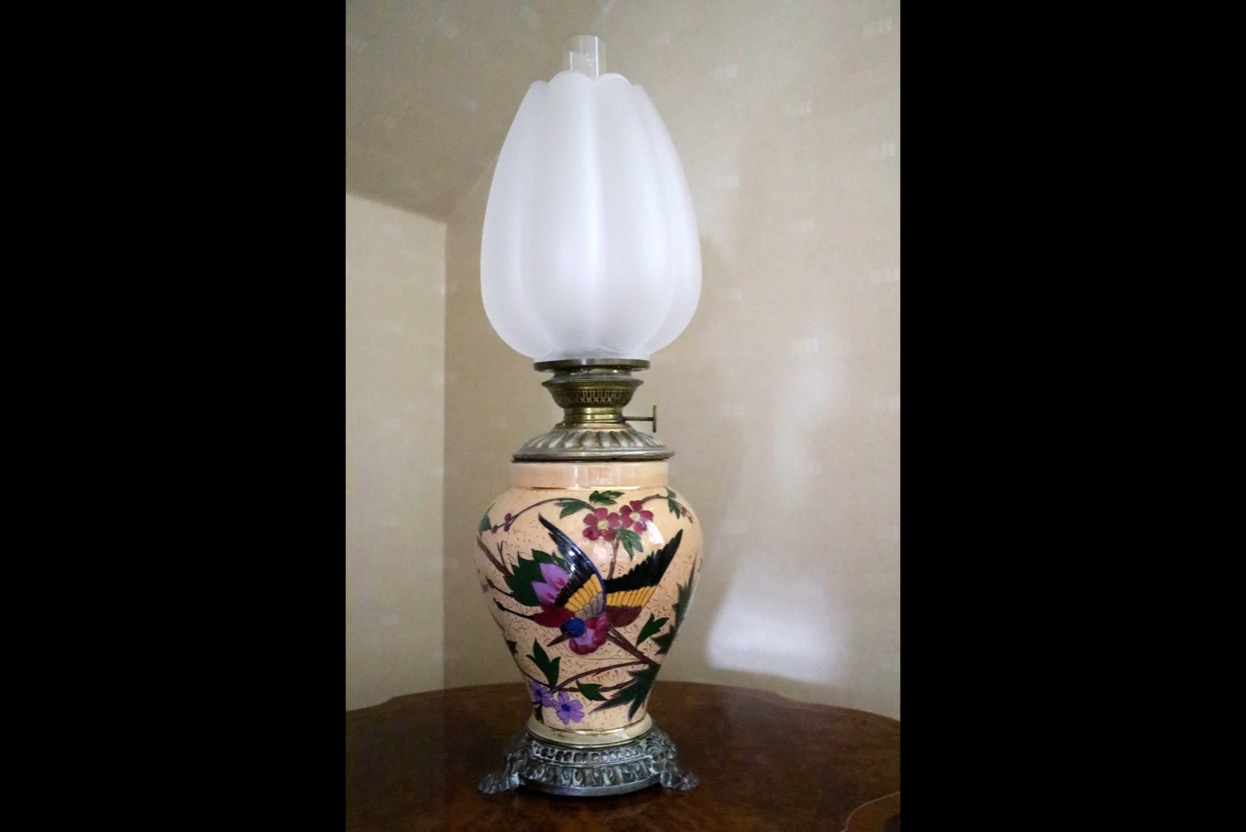 36286Bords fotogenlampa i Majolika -höjd 51 cm ök kupa. Säljes från välvårdat hem i Örebro utlämning S...