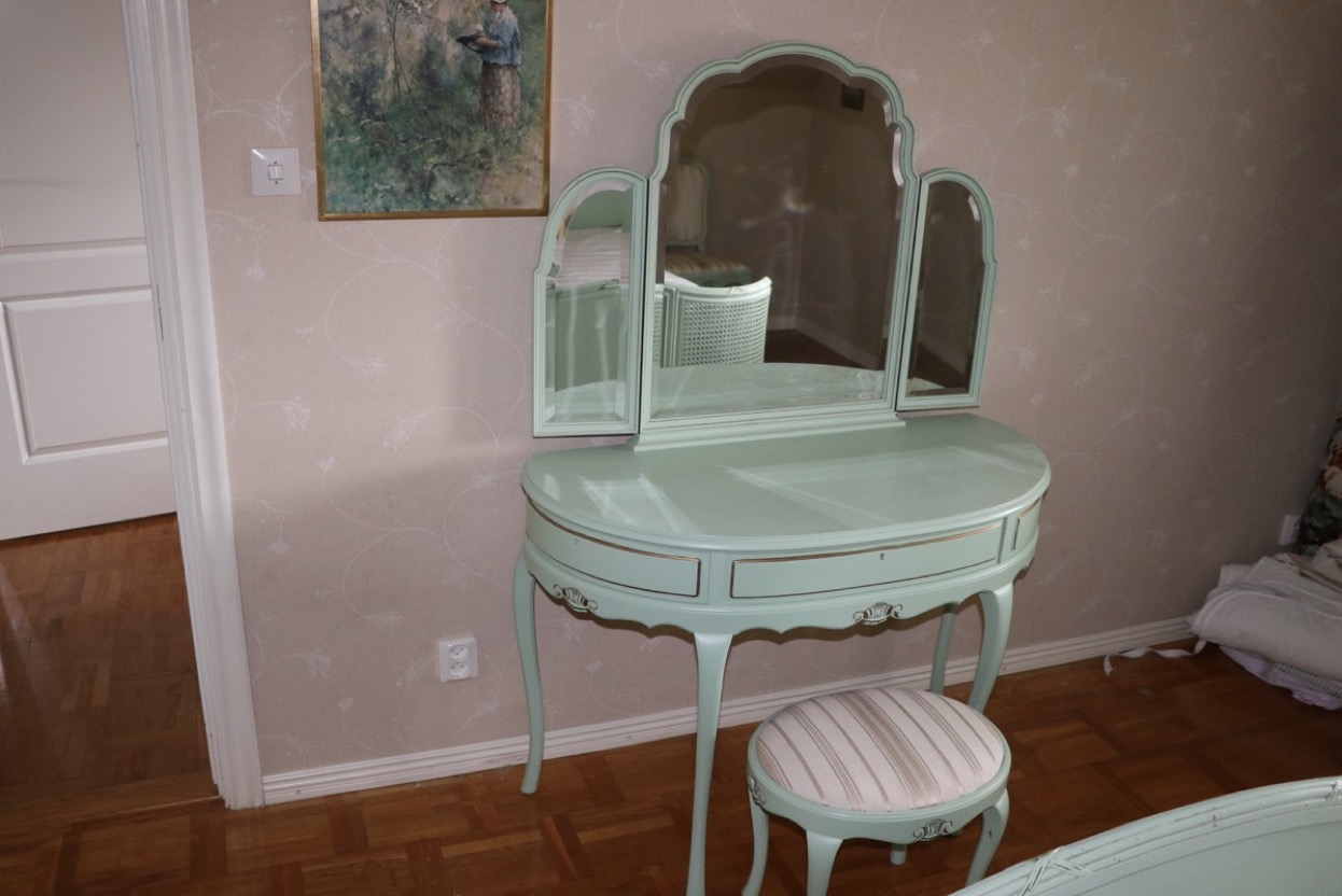 36290Toalettbord med pall - slipade spegelglas -svängbara sidospeglar -saknar lås -höjd 152 bredd 108 x ...
