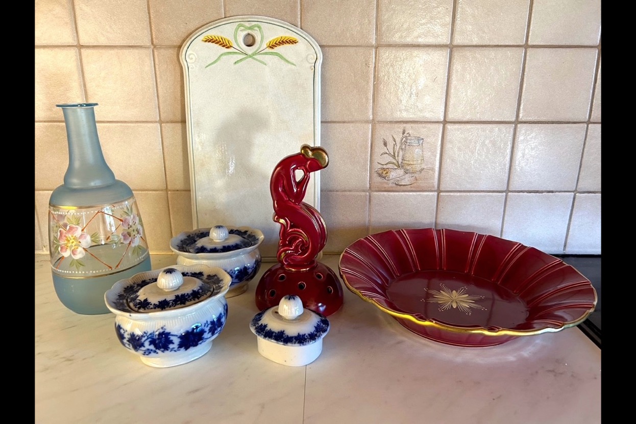 36330Äldre porslin bla Gefle Vinranka - Fruktskål med insats Röd Rubin - skärbräda -handmålad nattflaska ...