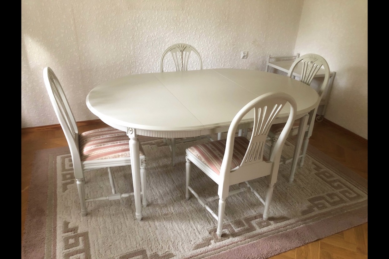 36340Matgrupp i Gustaviansk stil - bord med 4 klädda stolar med tyg i fint skick - bord diameter 110 cm +...