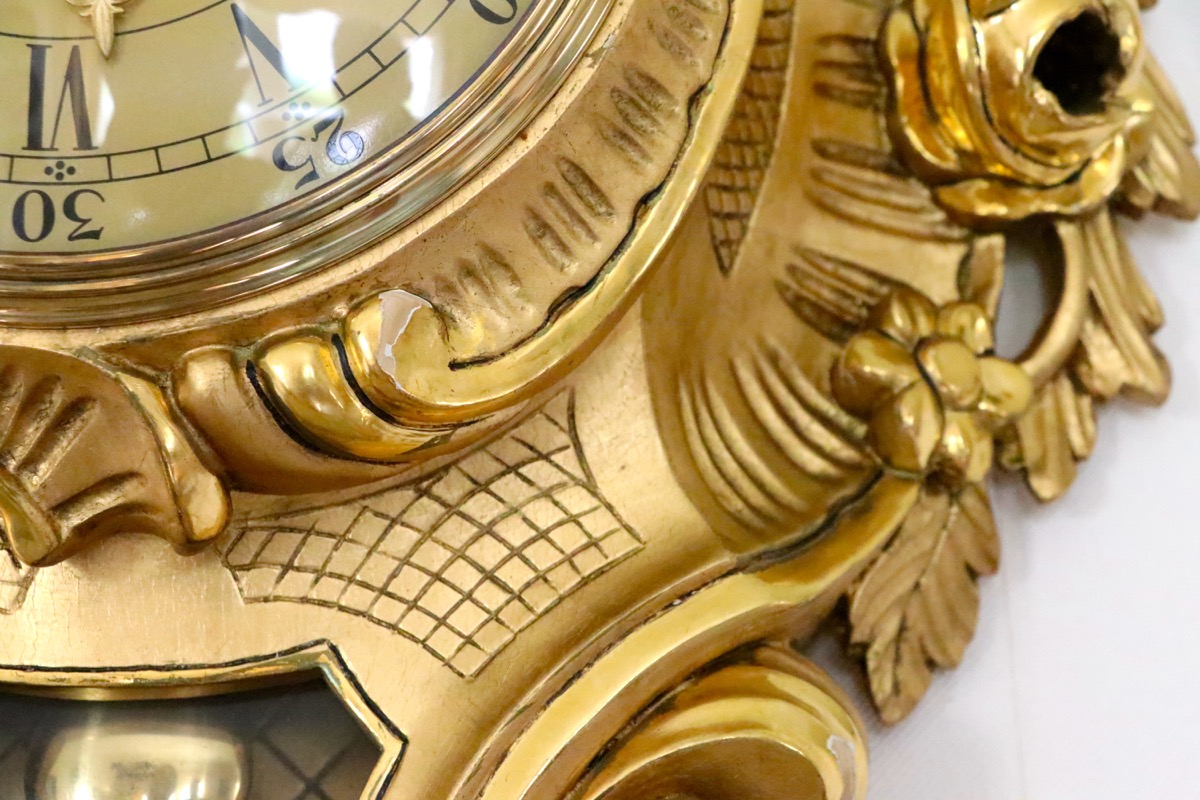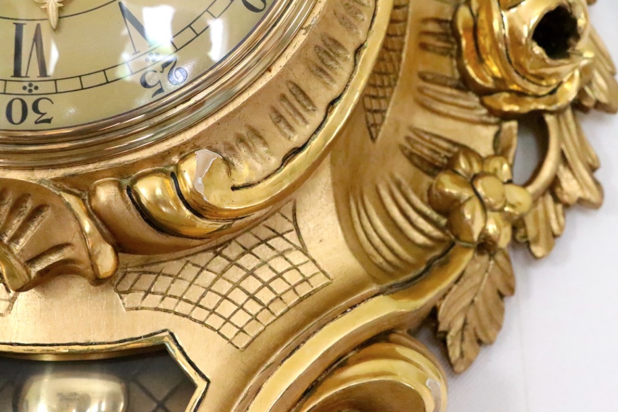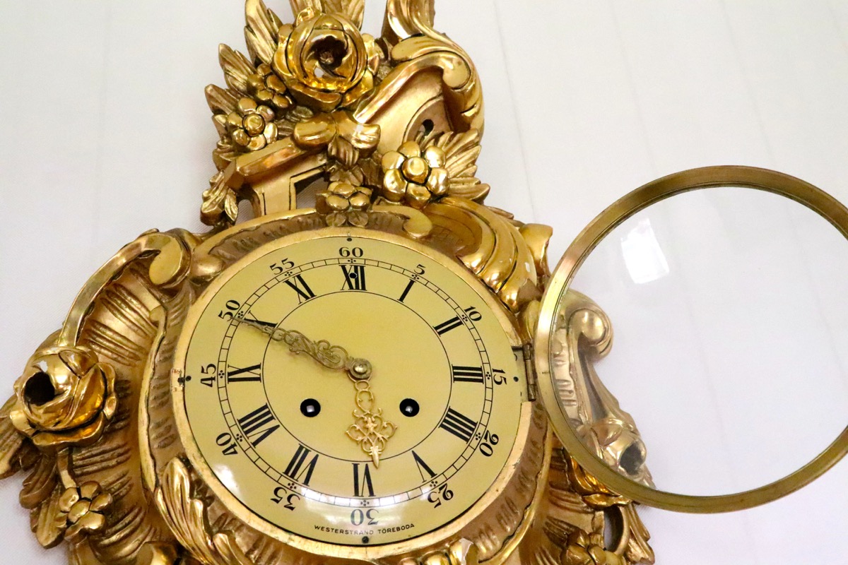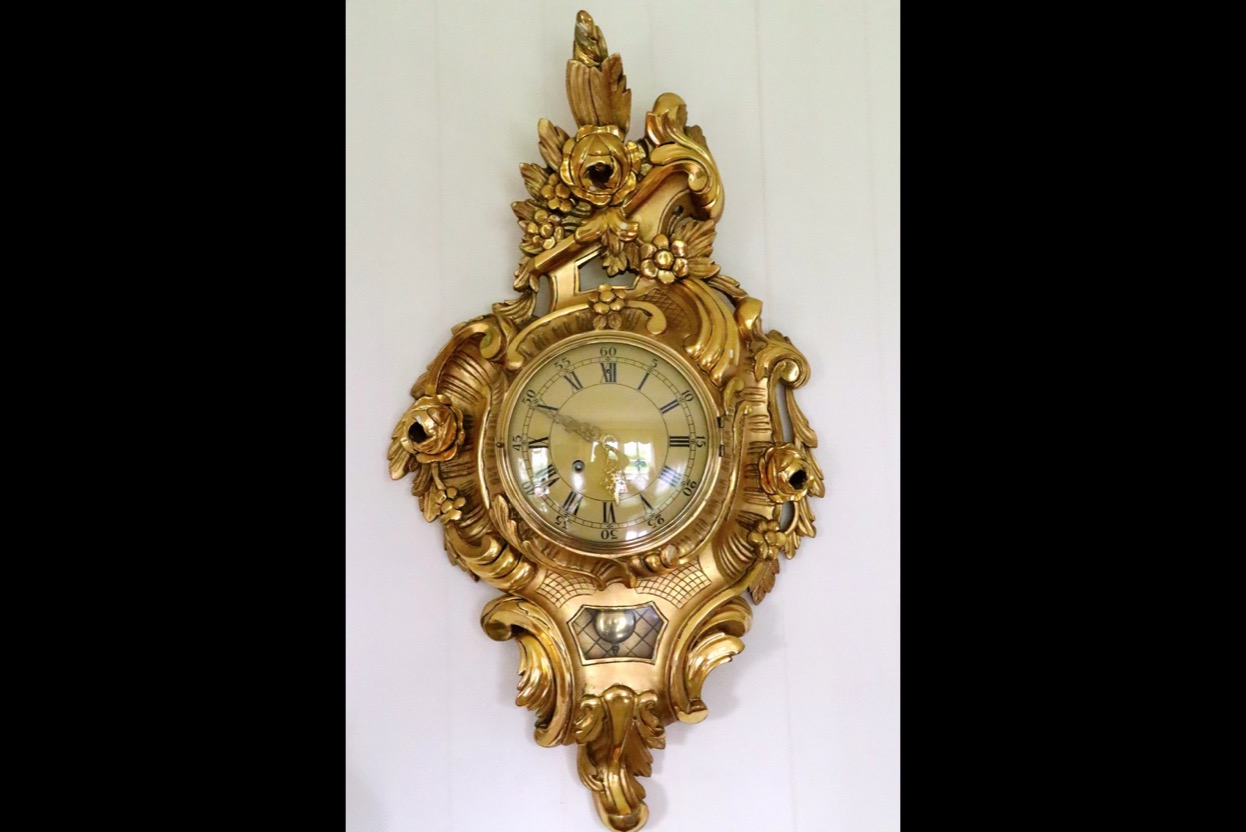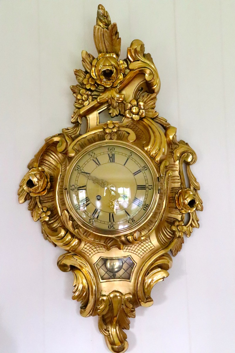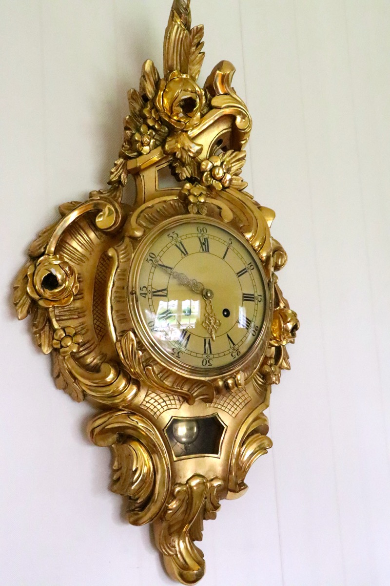 Större Väggur i förgyllt trä -höjd 74 x 40 cm. Säljes från välvårdat hem i Örebro utlämning Söndag 26 Oktober mellan kl 11.00 -15.00 -adress och kontaktuppgifter kommer på mail efter betalning.