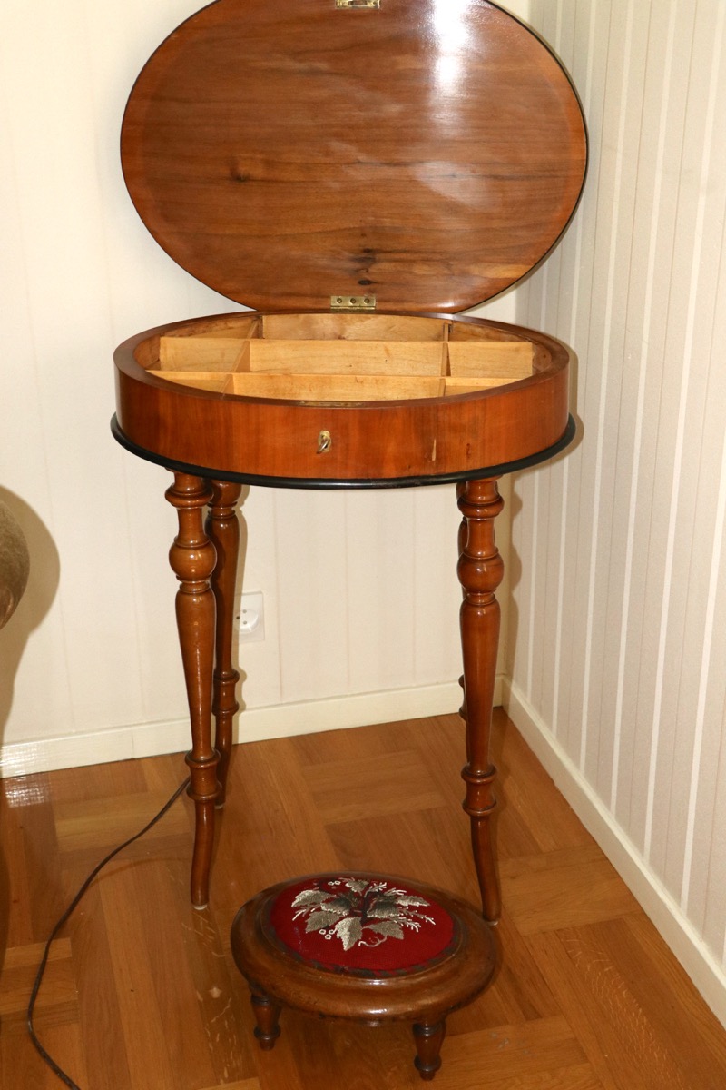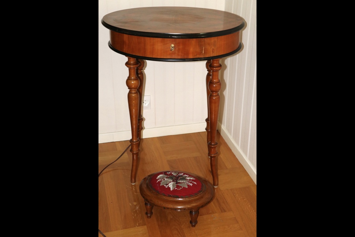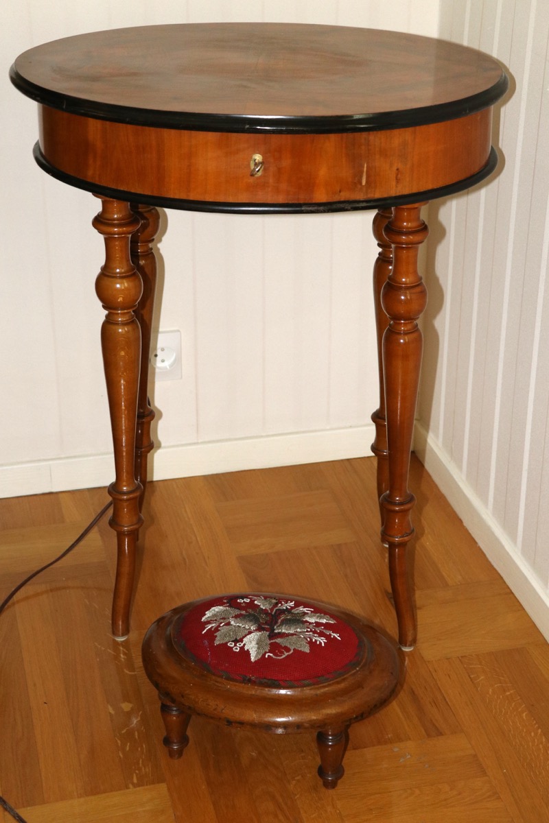 1800 tal -sybord i valnöt med pärl broderad fotpall - höjd bord 75 cm skiva 48x58 cm -åldersslitage. Säljes från välvårdat hem i Örebro utlämning Söndag 26 Oktober mellan kl 11.00 -15.00 -adress och kontaktuppgifter kommer på mail efter betalning.