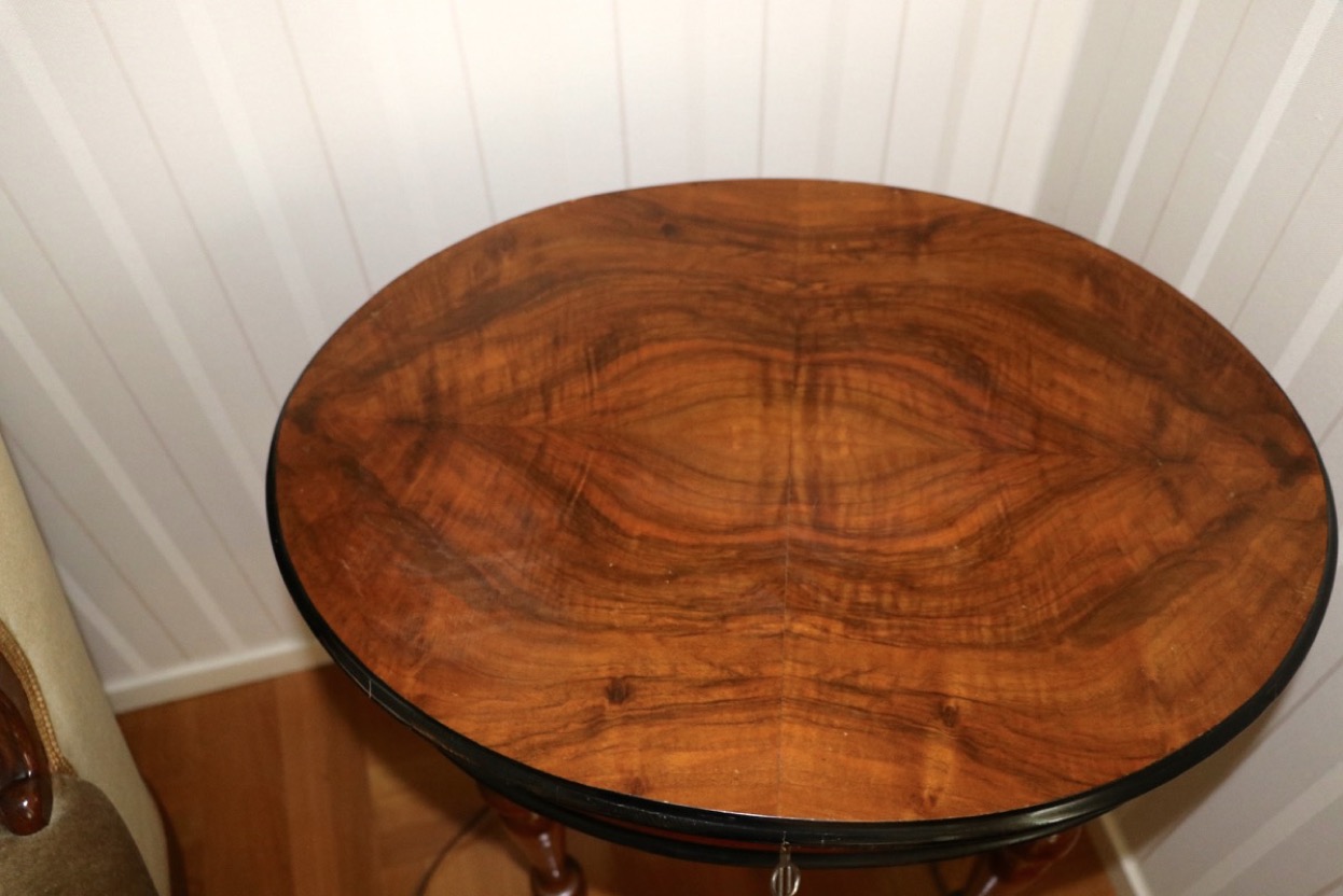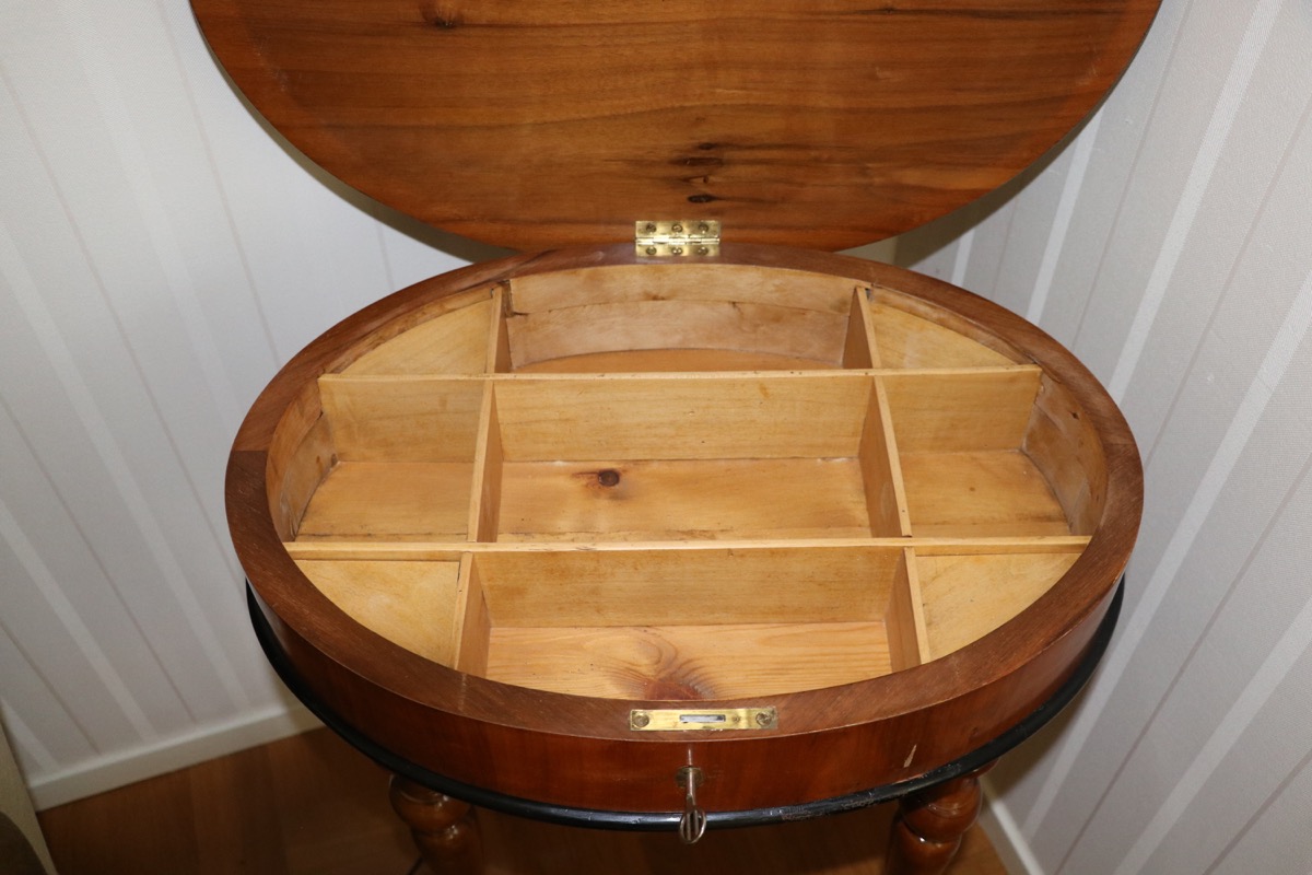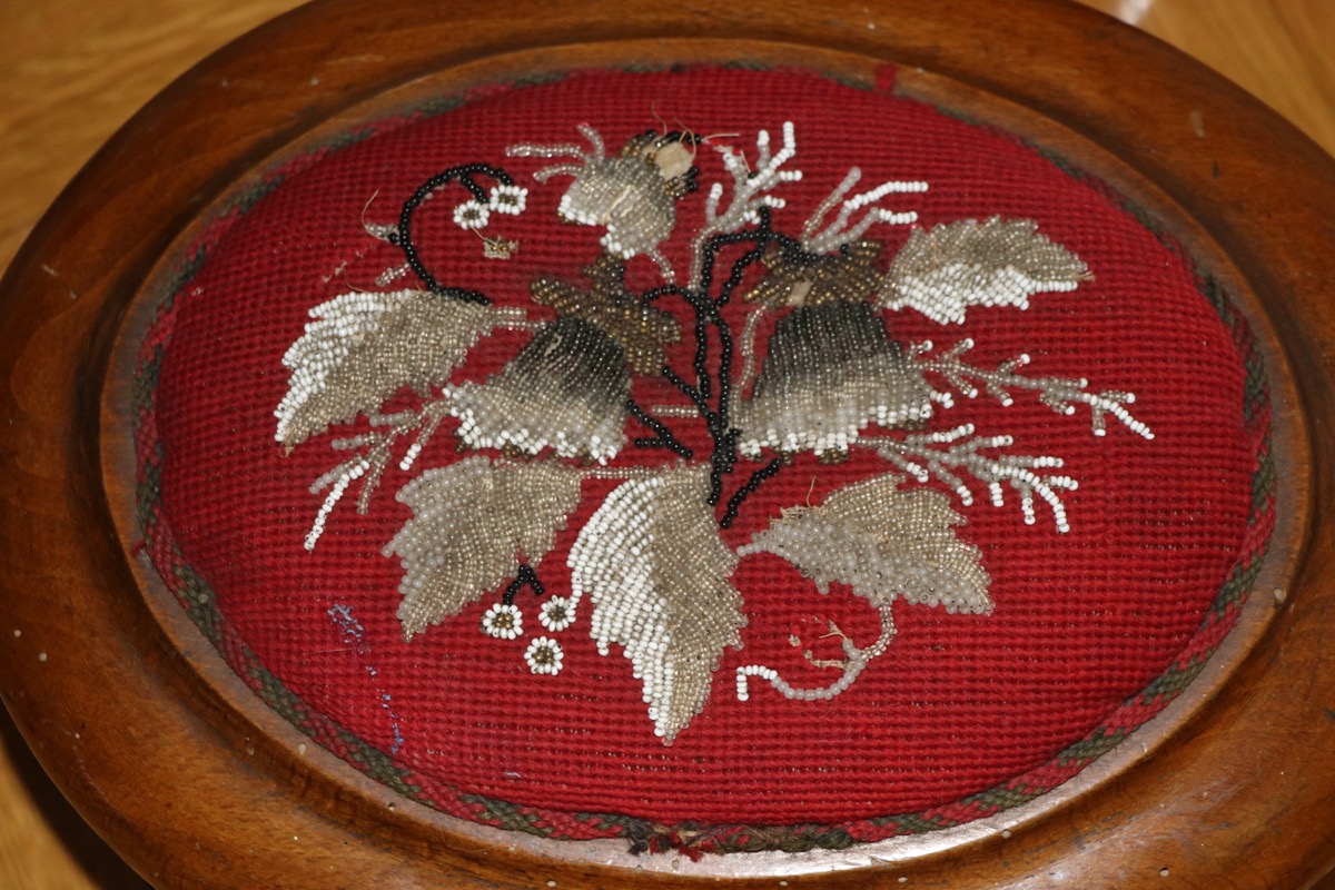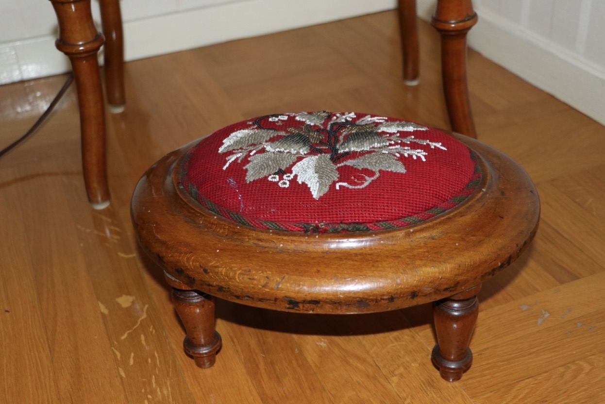 1800 tal -sybord i valnöt med pärl broderad fotpall - höjd bord 75 cm skiva 48x58 cm -åldersslitage. Säljes från välvårdat hem i Örebro utlämning Söndag 26 Oktober mellan kl 11.00 -15.00 -adress och kontaktuppgifter kommer på mail efter betalning.
