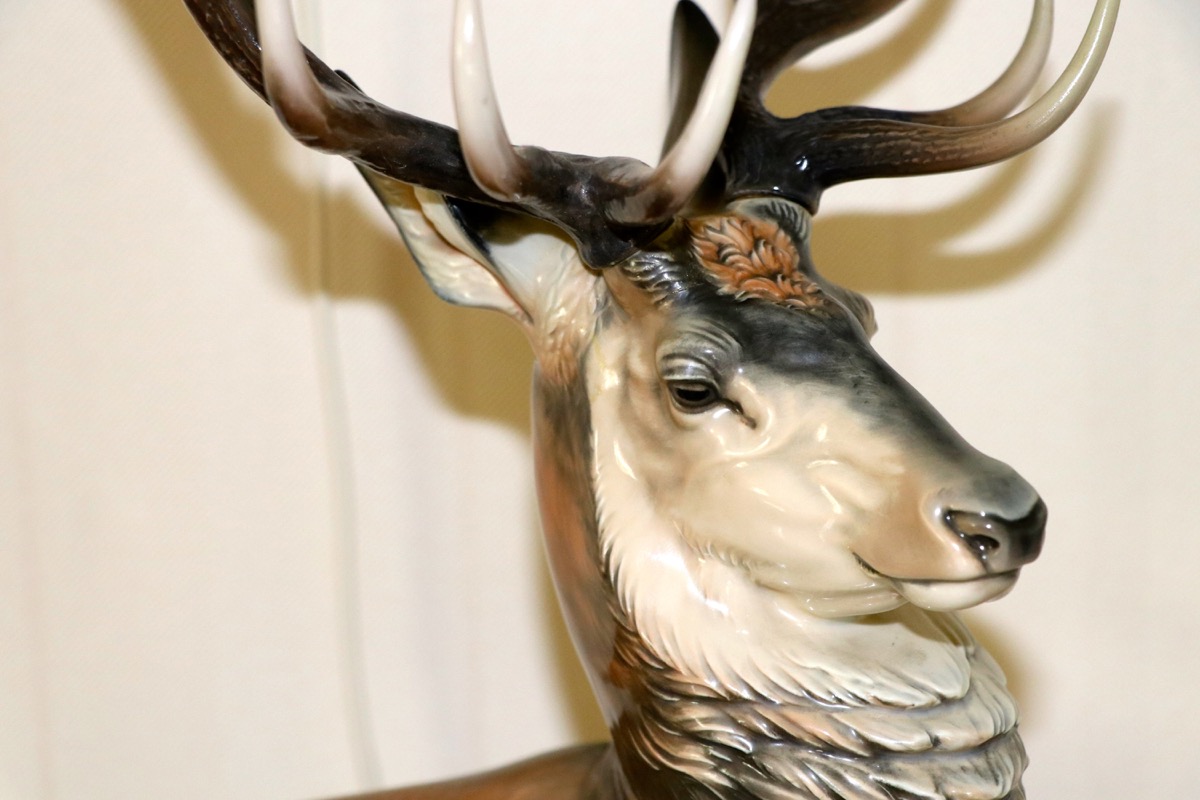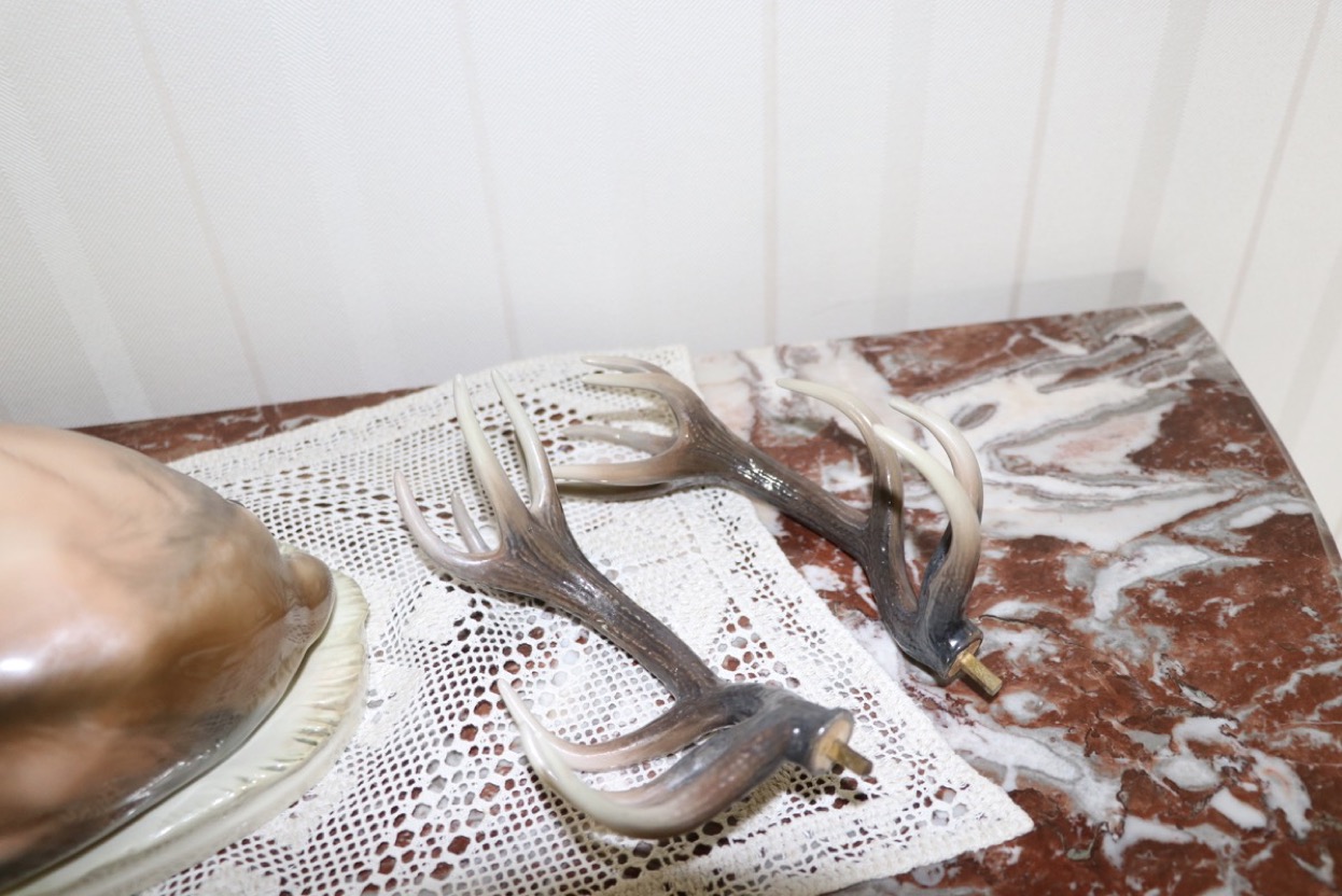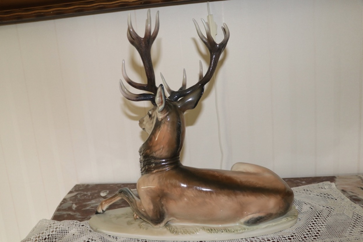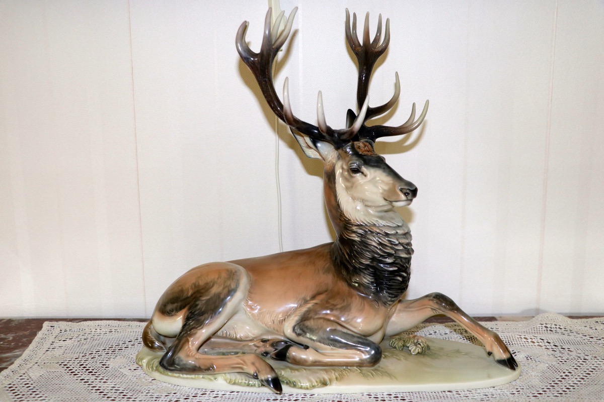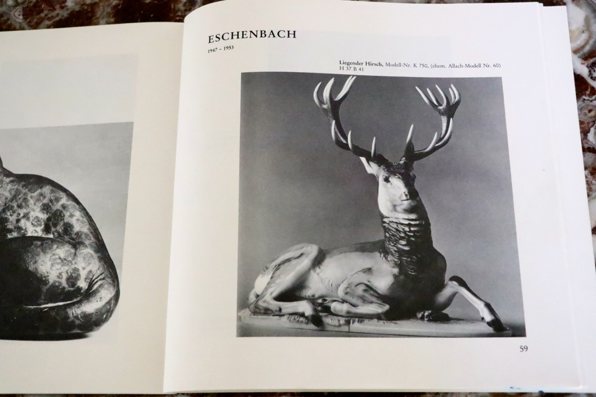 Praktpjäs liggande Hjort i porslin av Professor Theodor Kärner Eisenbach 1947-1953 - avbildad i medföljande bok Tyska Porslinsindustrins Muceum sid 59 -avtagbara horn vid transport - längd 41 cm höjd 41 cm. Säljes från välvårdat hem i Örebro utlämning Söndag 26 Oktober mellan kl 11.00 -15.00 -adress och kontaktuppgifter kommer på mail efter betalning.