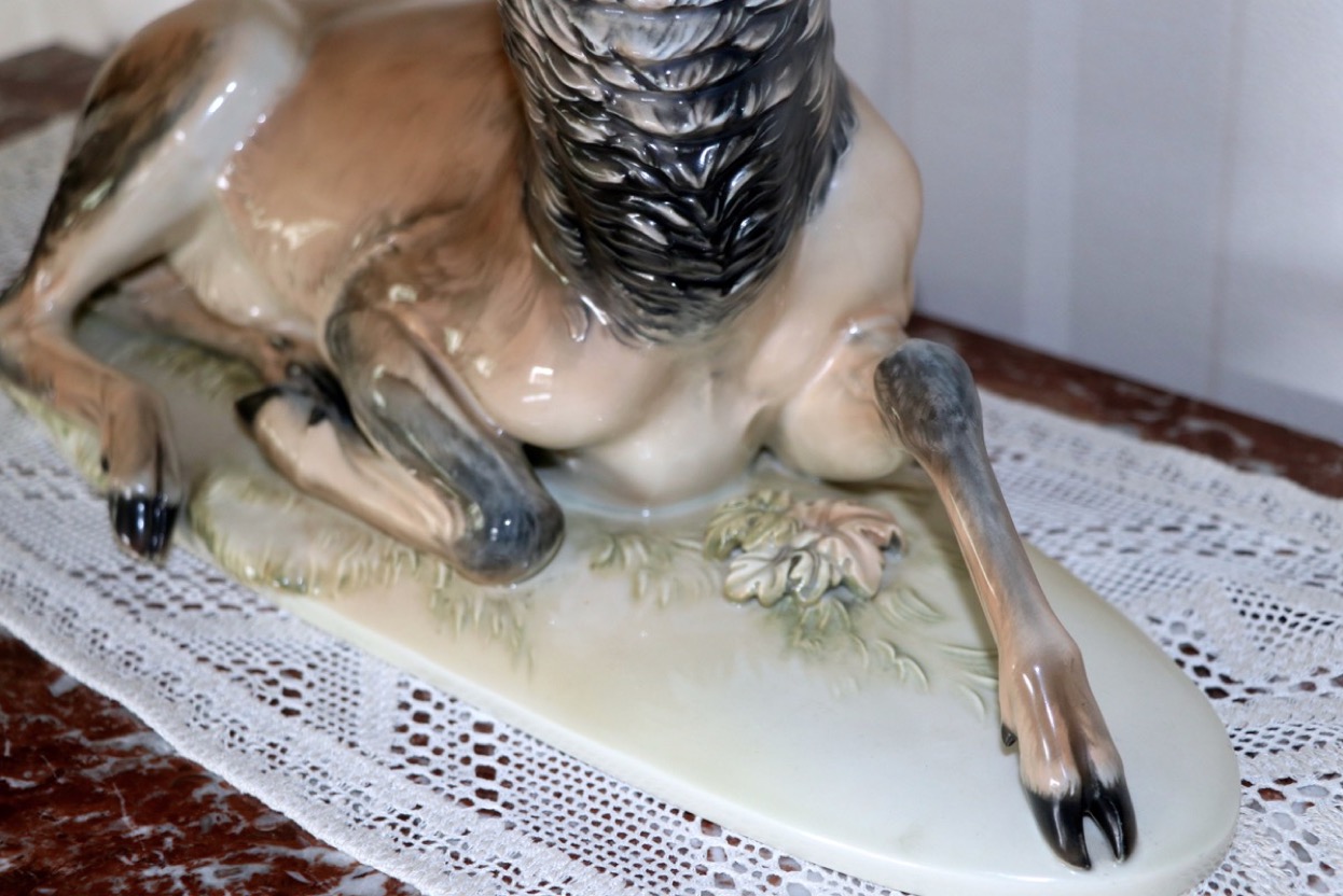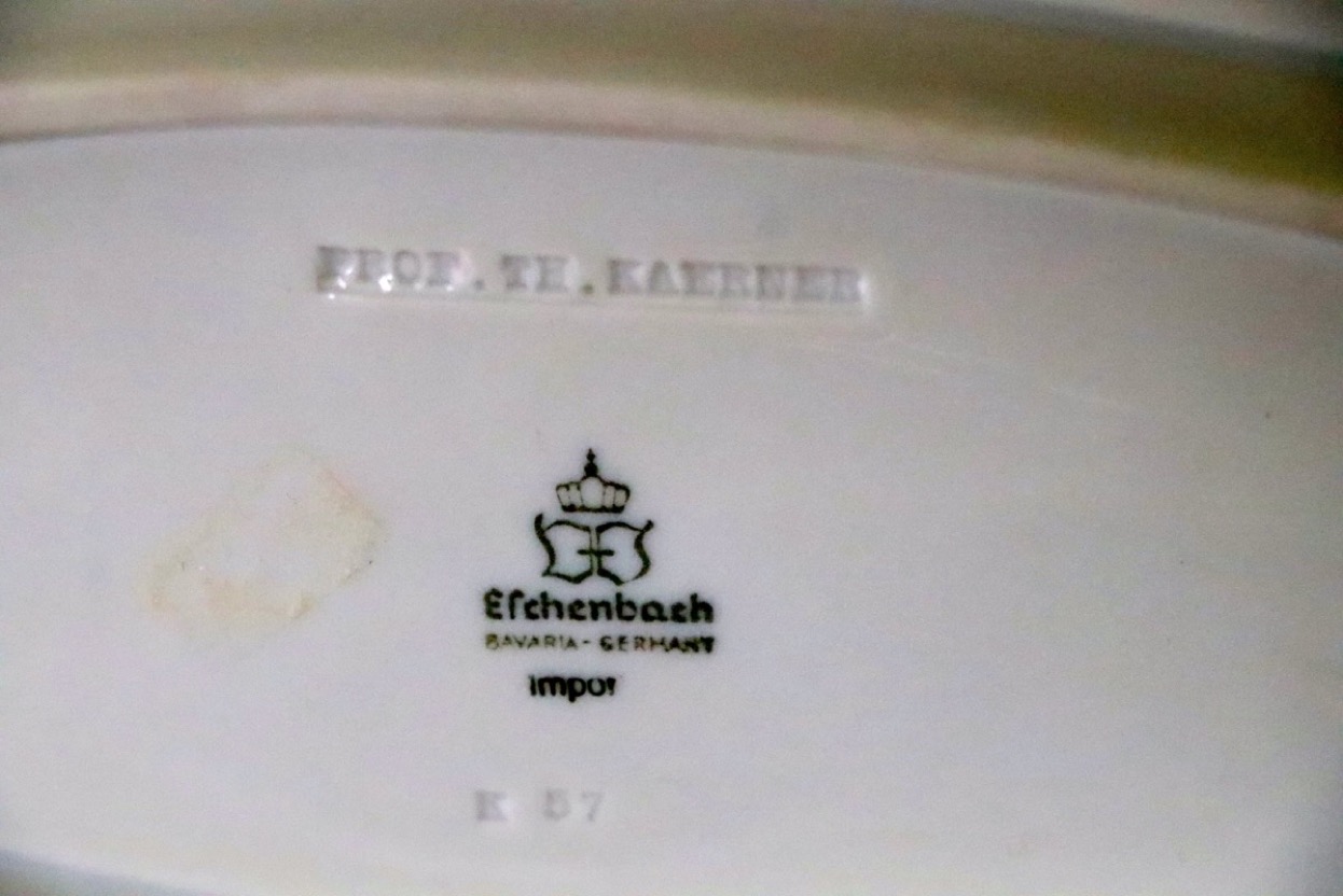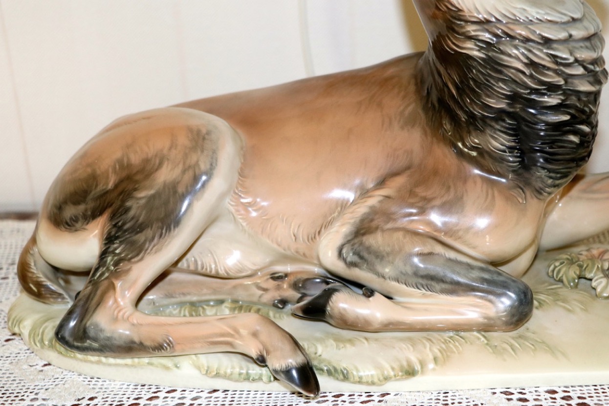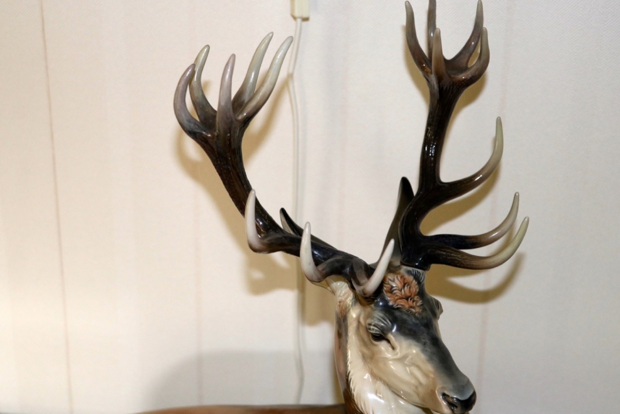 Praktpjäs liggande Hjort i porslin av Professor Theodor Kärner Eisenbach 1947-1953 - avbildad i medföljande bok Tyska Porslinsindustrins Muceum sid 59 -avtagbara horn vid transport - längd 41 cm höjd 41 cm. Säljes från välvårdat hem i Örebro utlämning Söndag 26 Oktober mellan kl 11.00 -15.00 -adress och kontaktuppgifter kommer på mail efter betalning.