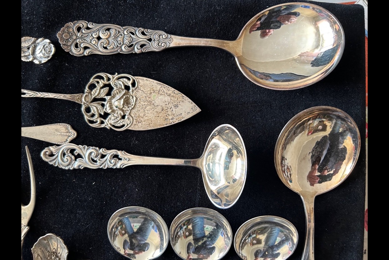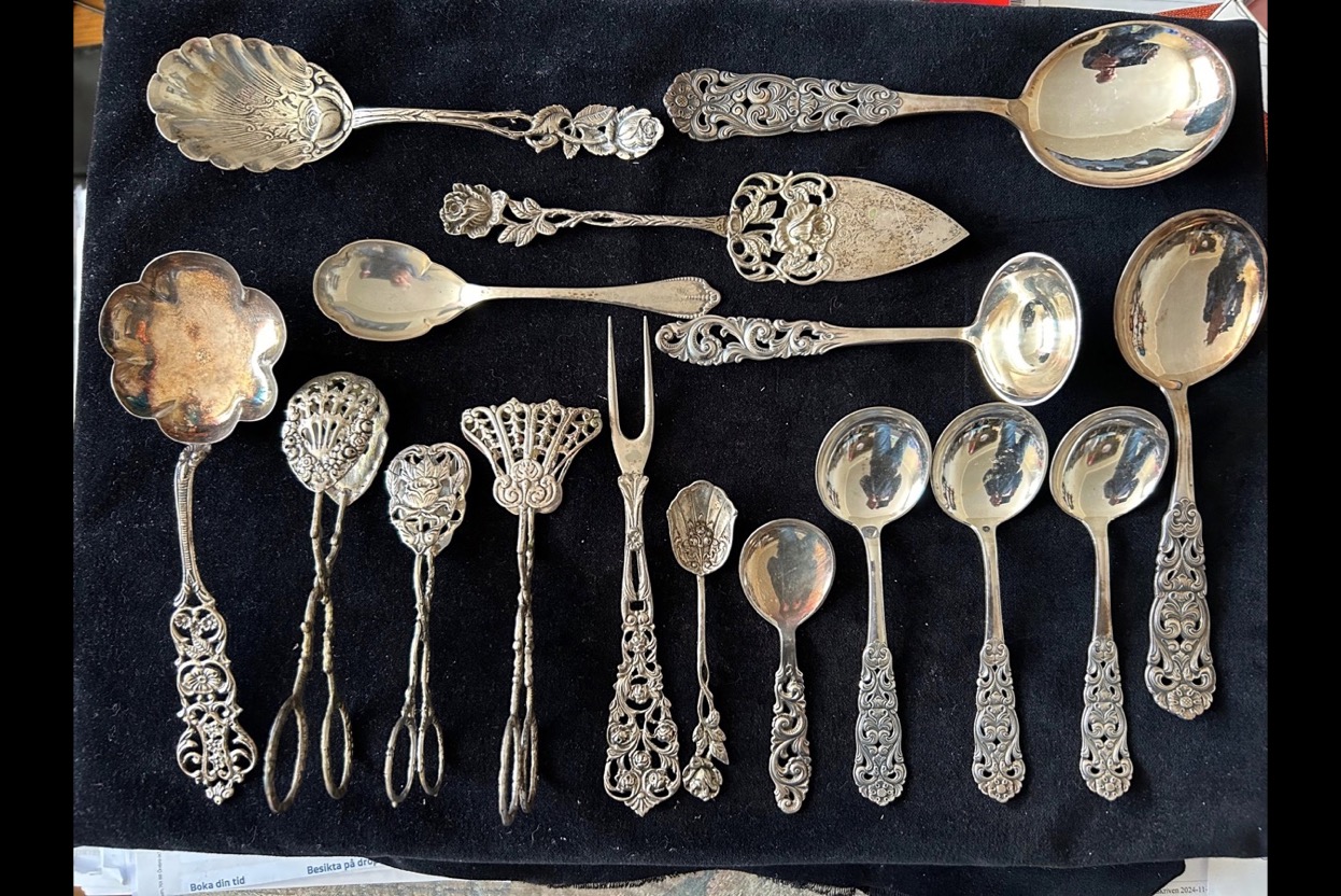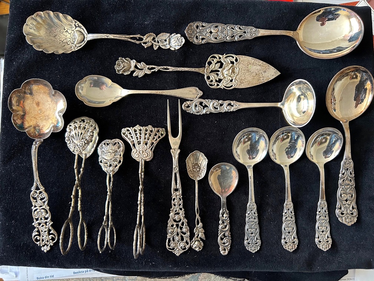 Kontrollerat silver: bla kaktänger -tårtspade -skedar - total vikt 530 gram. Säljes från välvårdat hem i Örebro utlämning Söndag 26 Oktober mellan kl 11.00 -15.00 -adress och kontaktuppgifter kommer på mail efter betalning.