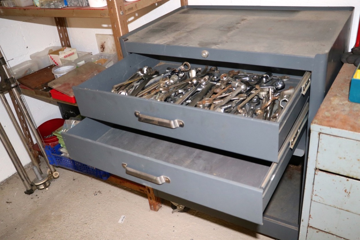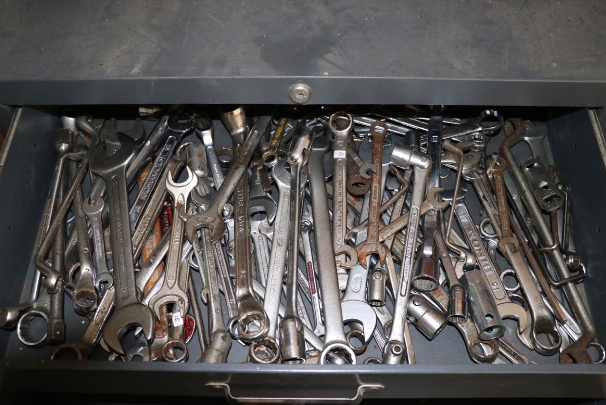 Verktygs skåp i metall med en mängd ring o lednycklar -skåp: bredd 700mm höjd 850mm djup 460mm. Lagerort ca 2 mil Norr Örebro -avhämtning efter ök -kontaktuppgifter kommer på mail efter betalning.