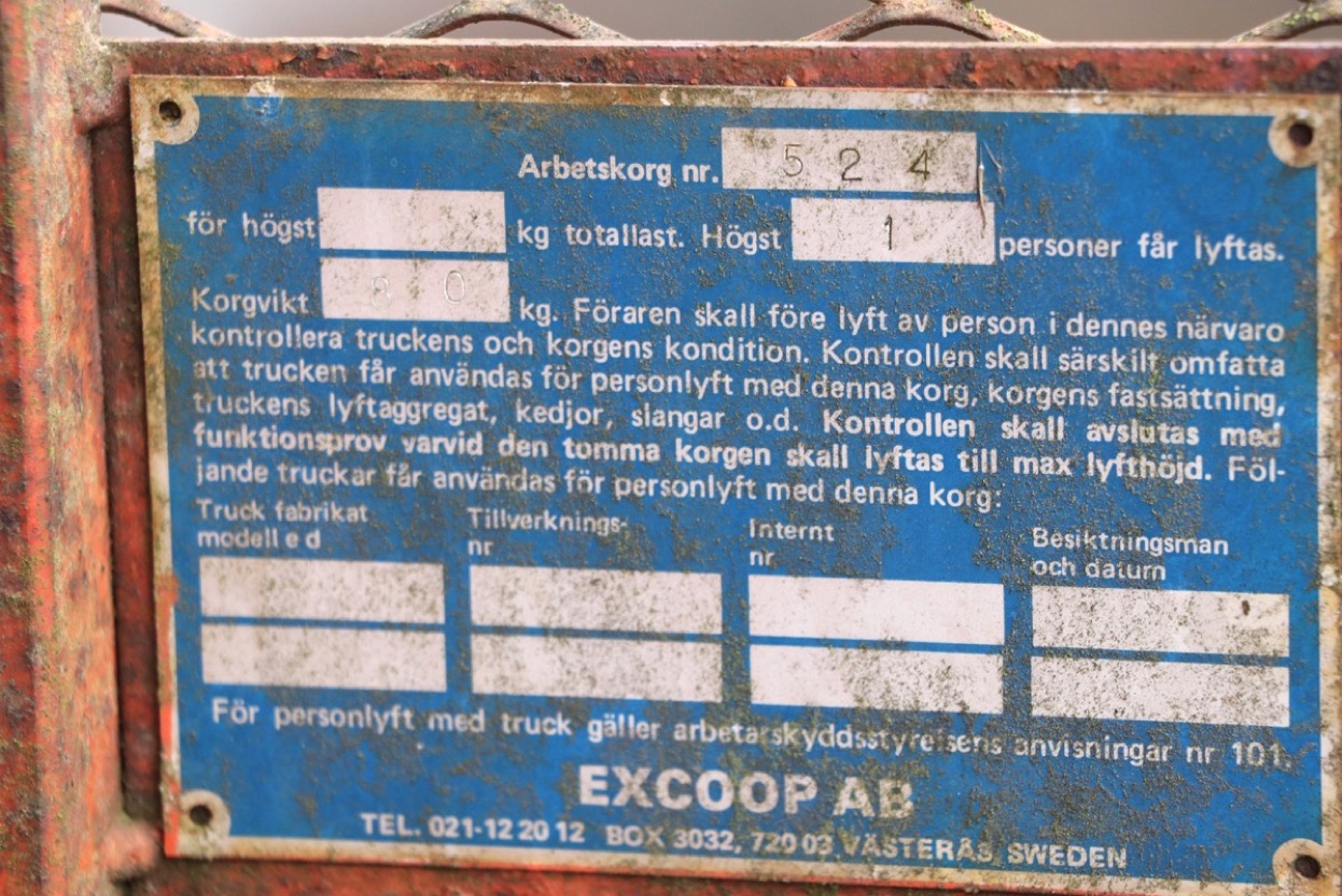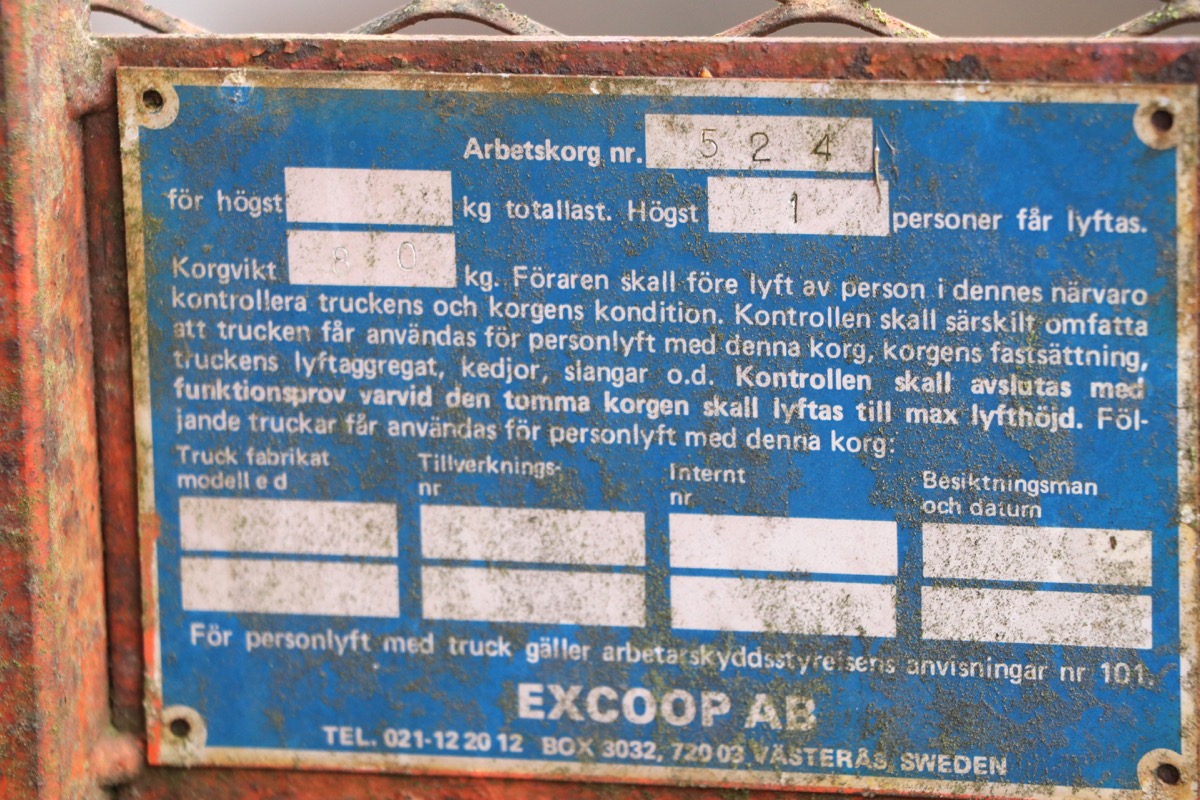 Arbetskorg EXCOOP för pallgafflar mått invändigt 1000 x 800 mm -bruksslitage. Lagerort Nora - avhämtning efter ök - kontaktuppgifter kommer på mail efter betalning -last hjälp med maskin kan erhållas. OBS att moms tillkommer på klubbat pris.