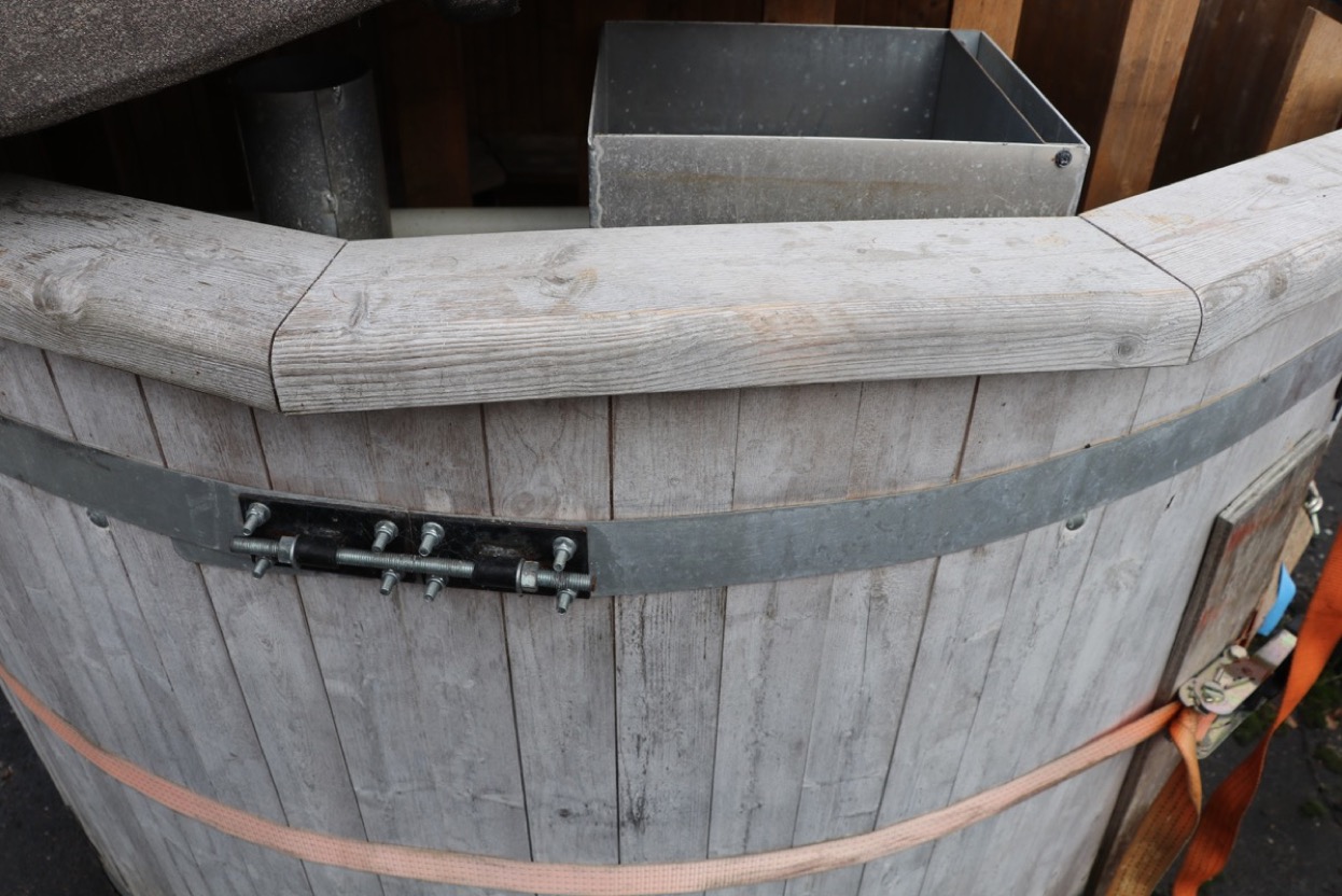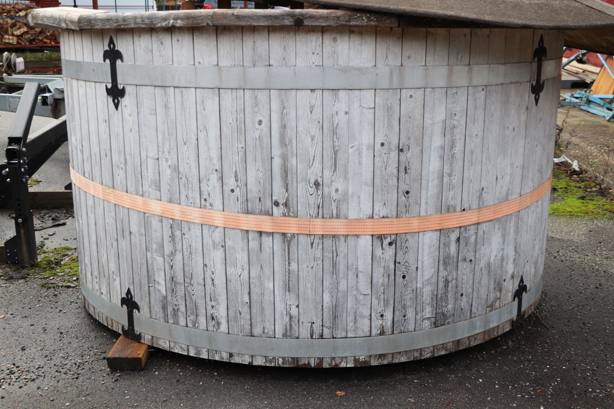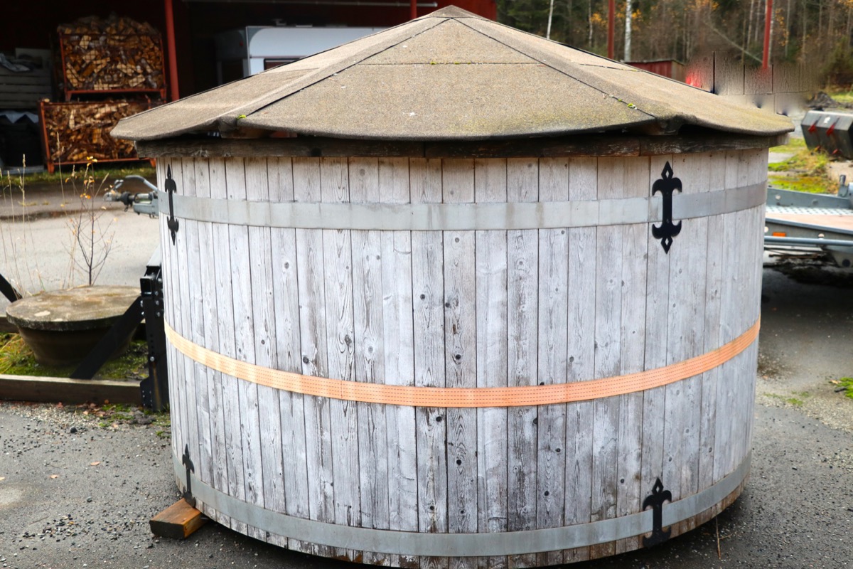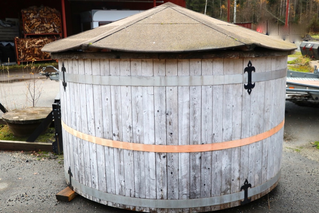 Vedeldad badtunna i trä - 6 - 8 sittplatser - vedaggregat i rostfritt stål - diameter ca 2000 mm -bruksslitage. Lagerort Nora - avhämtning efter ök - kontaktuppgifter kommer på mail efter betalning -last hjälp med maskin kan erhållas. OBS att moms tillkommer på klubbat pris.